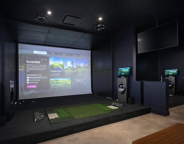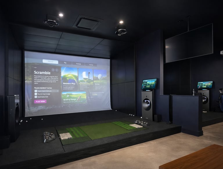 Audio-visual installation for an indoor golf entertainment venue featuring, integrated displays, sound systems, and control technology designed to deliver an immersive guest experience