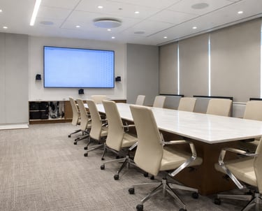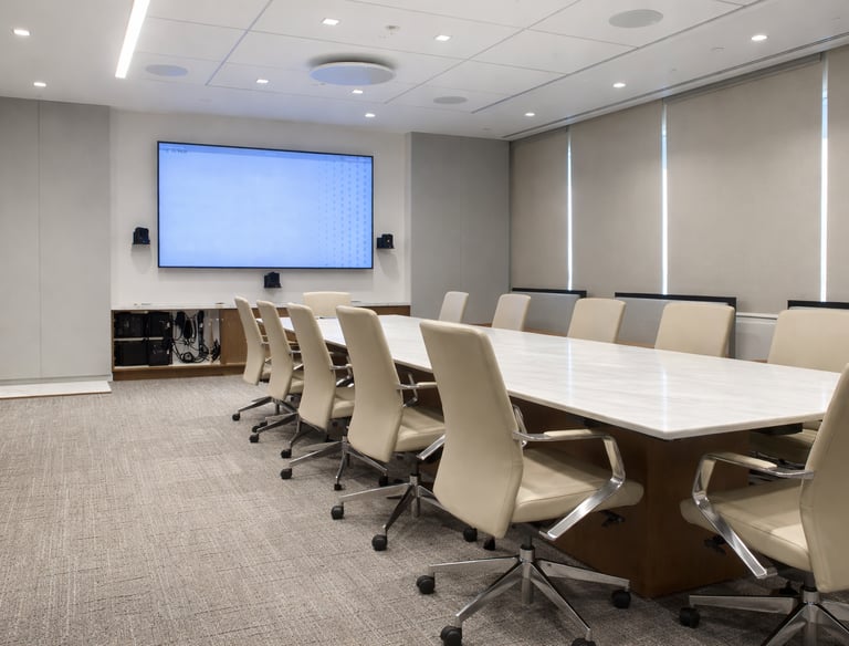 Conference room AV integration featuring large-format displays, video conferencing systems, and structured cabling designed to support modern workplace collaboration.